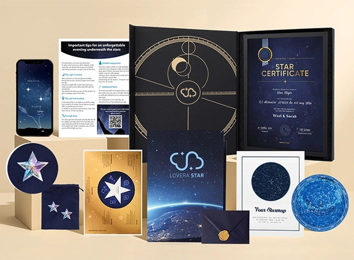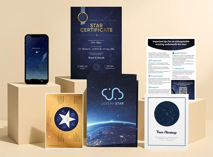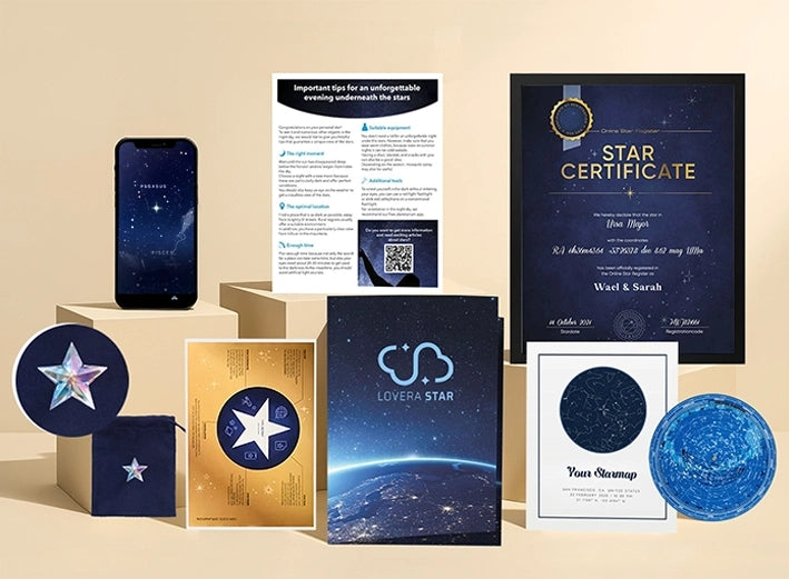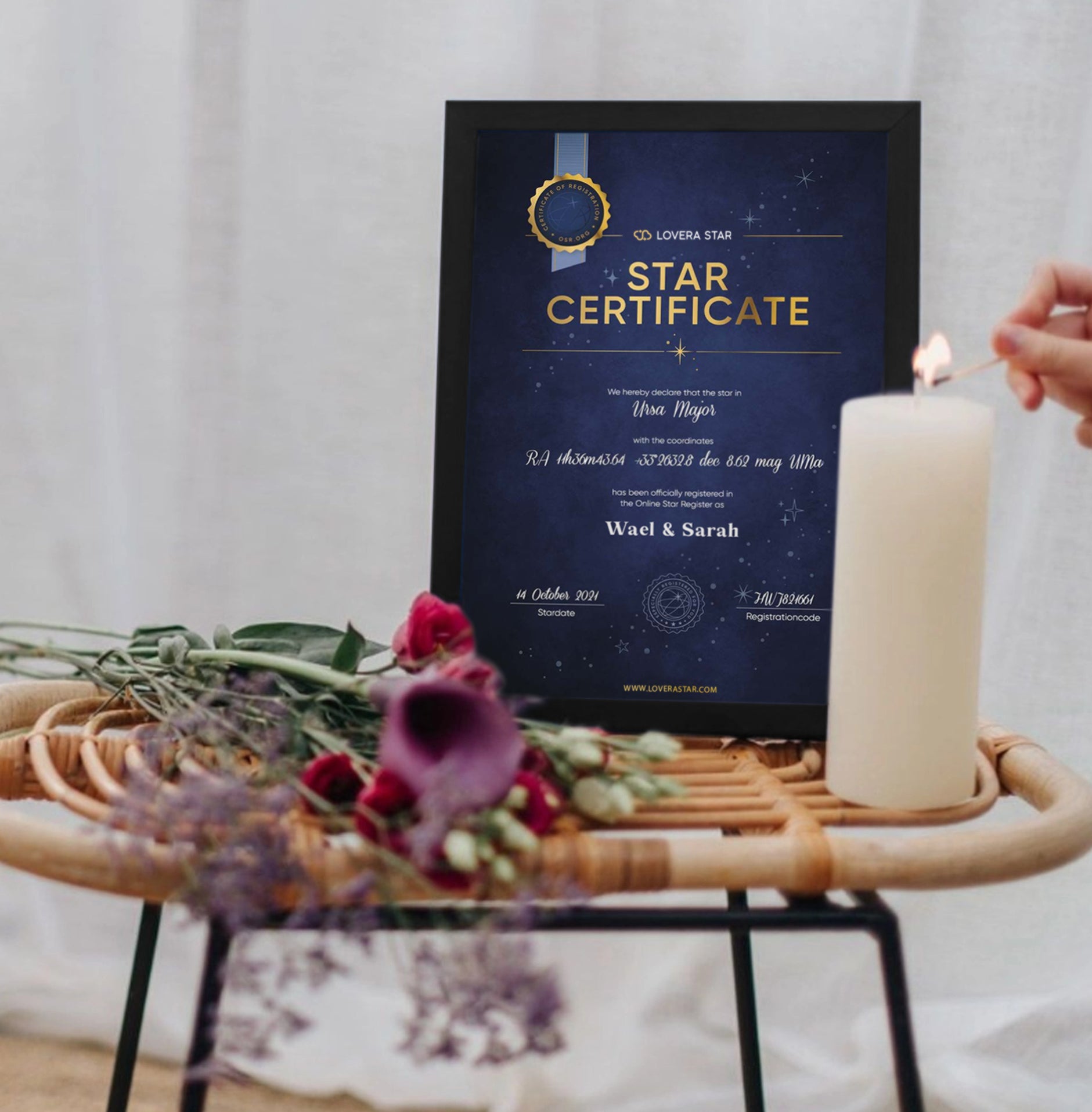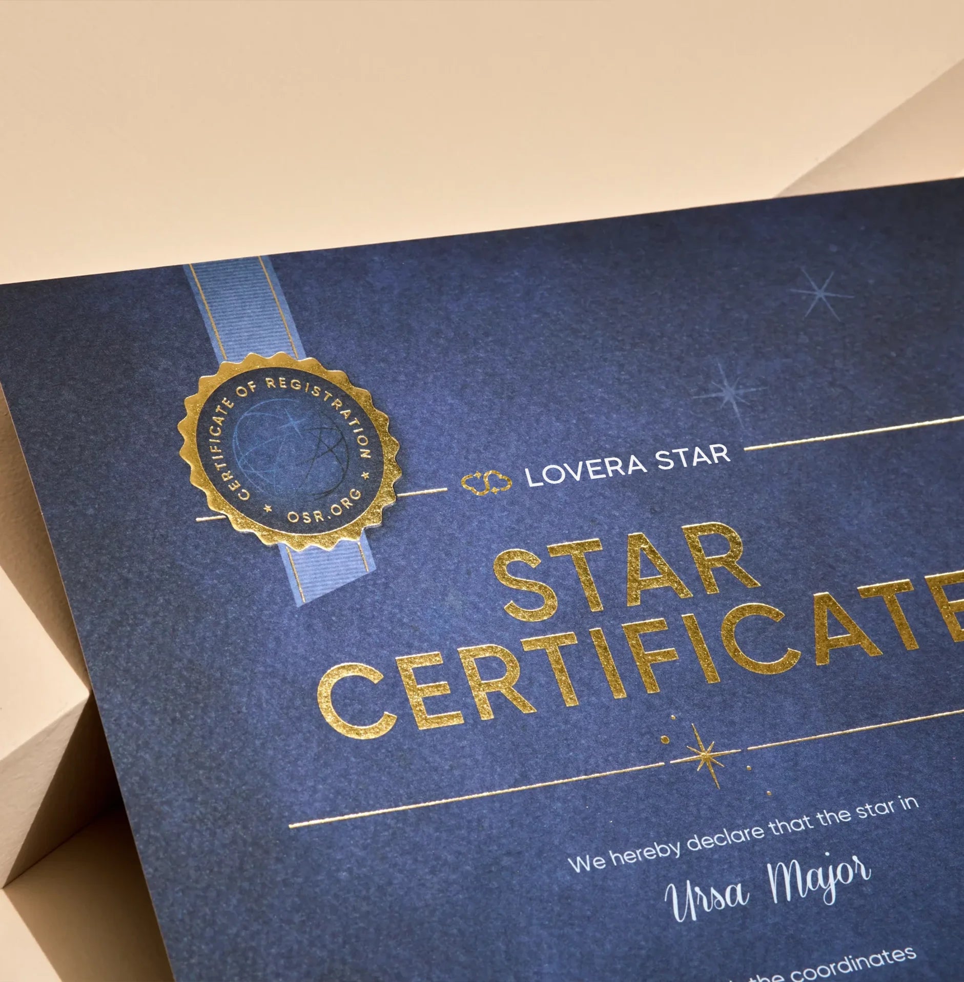 كل نجم بييجى معاه شهادة فاخرة من لوفيرا ستار, بتوثق الاسم و الاحداثيات والتاريخ اللى بتختاره, و مكتوب فيها رسالتك الخاصة.